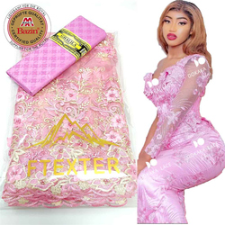قماش بازين وردي + ريتش ياردة دانتيل شبكي مطرز بالخرز عالي الجودة قماش بازين لامع لغامبيا فستان حفلات زفاف دانتيل