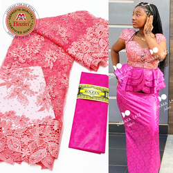 ผ้าลูกไม้2.5 + 2.5หลาสีชมพูพร้อมปักและลูกปัดผ้าบาซินริชเบียสำหรับชุดแต่งงาน
